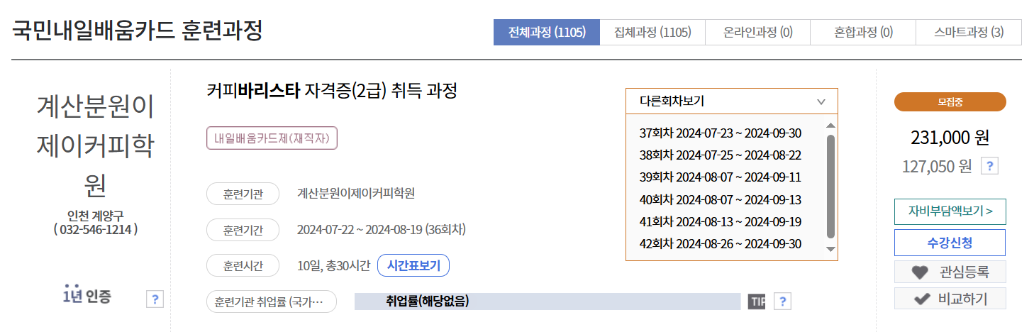 국비지원을 받아서 바리스타 자격증 교육을 받으려면 먼저 내일배움카드를 발급 받아야 합니다.